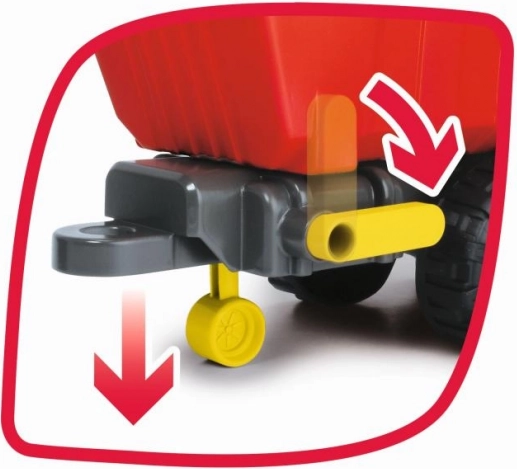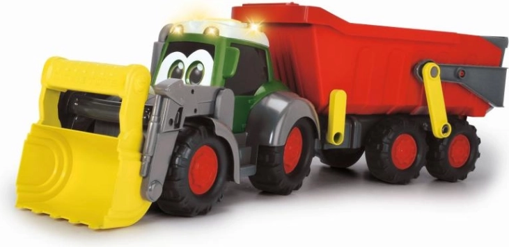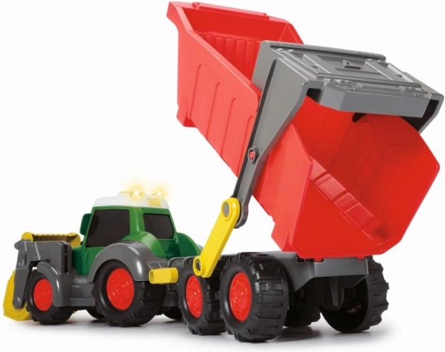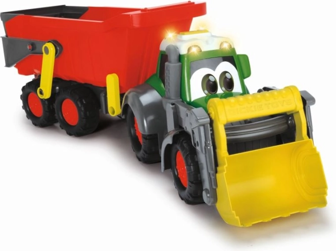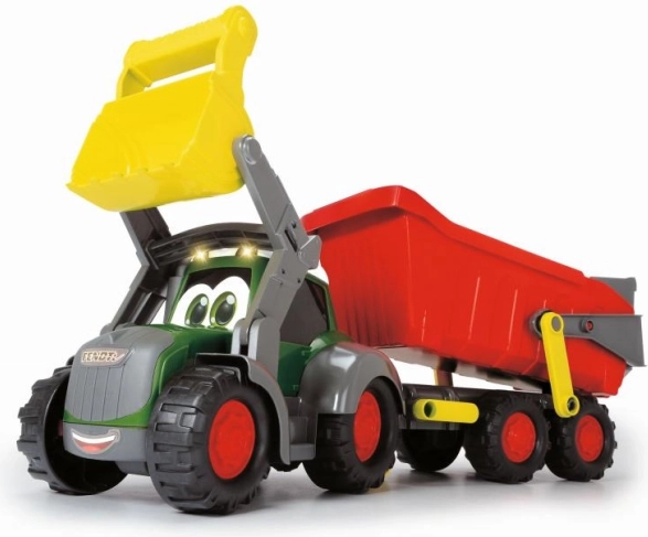 Traktor má pohyblivú lopatu a príves s funkciou sklápanie, čo umožňuje ľahké nakladanie a vykladanie materiálu.