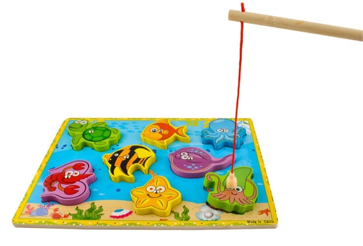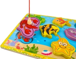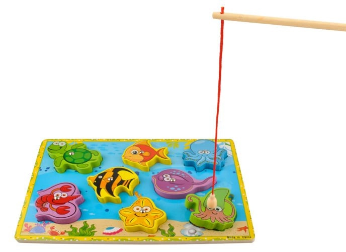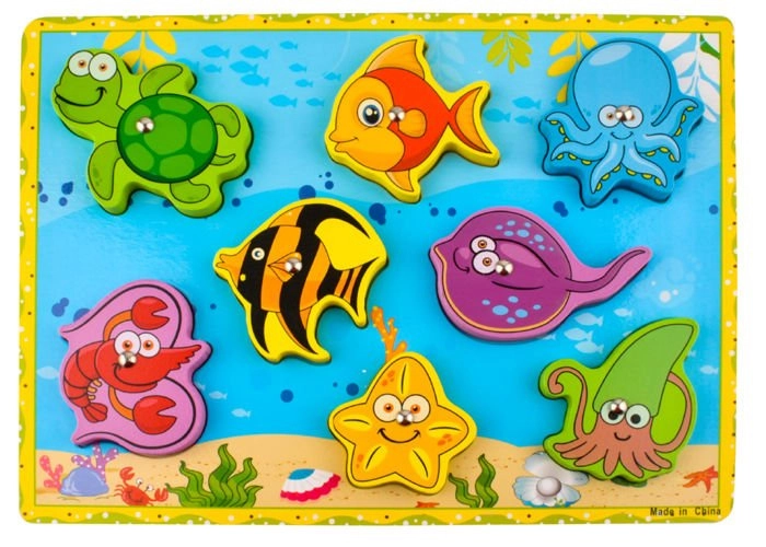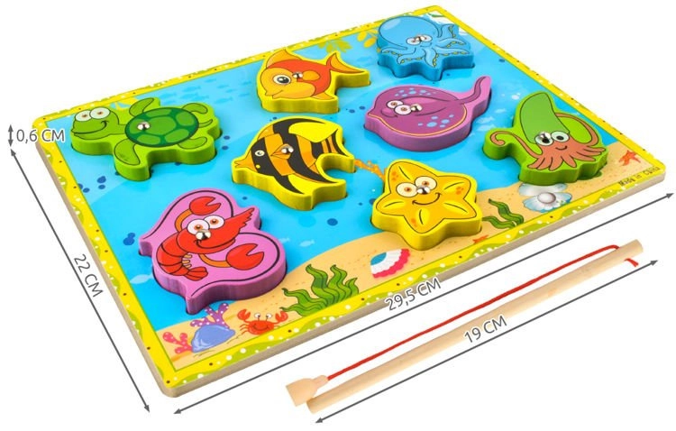 Táto farebná drevená skladačka s magnetickým prútom premení učenie na hru. Deti vkladajú 8 morských zvieratiek do správnych výrezov a pomocou magnetu ich aj „vylovia“ z dosky. Silné magnety uľahčujú manipuláciu aj menším deťom a podporujú istotu úchopu.