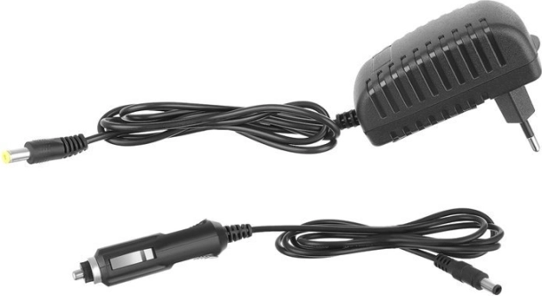 Súčasťou je sieťový adaptér aj autoadaptér. Elastický popruh umožní pripevnenie k opierke alebo kancelárskej stoličke pre pohodlné používanie kdekoľvek.