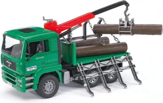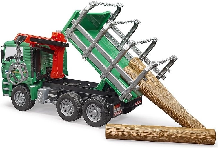 Bruder MAN nákladné vozidlo s prívesom na prepravu dreva je detailne prepracovaný plastový model v mierke 1:16. Vozidlo je vybavené otočným žeriavom za kabínou, ktorý umožňuje jednoduché nakladanie a vykladanie dreva. Súčasťou balenia sú tri realistické kmene, ktoré robia hru ešte autentickejšou.