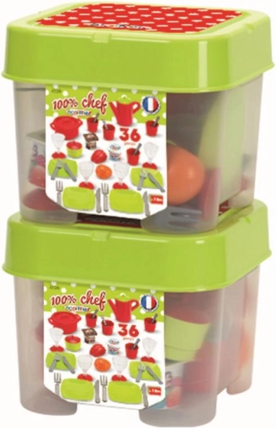Kompletný jedálenský set v boxe pre malých kuchárov obsahuje všetko potrebné na servírovanie pohostenia. Nájdete v ňom taniere, príbory, poháriky, hrnčeky, kanvičku s vrchnákom, hrniec s pokrievkou a tiež ovocie a jogurt. Skvelá voľba na rozvoj fantázie, role-play a jemnej motoriky.