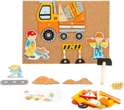 Korková tabuľa s pripináčikmi umožňuje opakované skladanie a prestavovanie dopravných a stavebných scén podľa fantázie detí.
