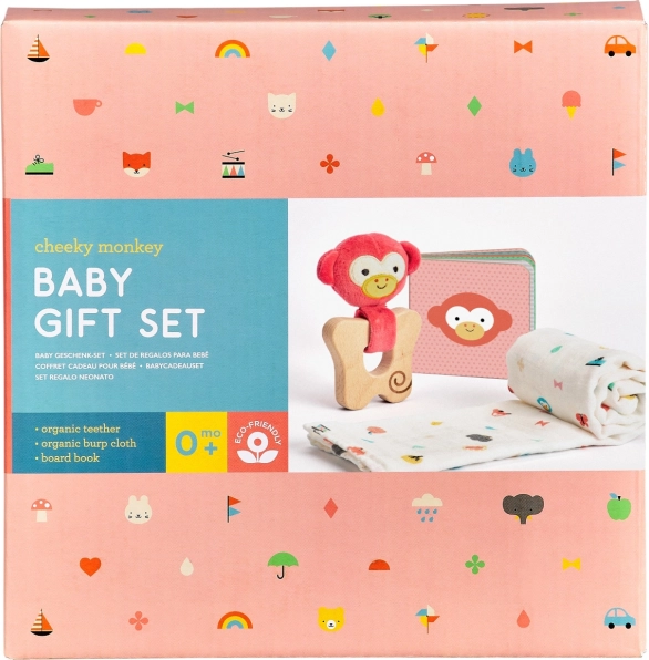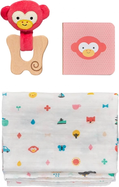 Štýlový darčekový set pre novorodencov s motívom opičky od PETIT COLLAGE poteší praktickými doplnkami a ohľaduplnosťou k prírode. Obsahuje hryzátko z FSC bukového dreva, mäkkú šatku z organickej bavlny a kartónovú obrázkovú knižku. Balenie je úplne bez plastov a materiály pochádzajú z udržateľných zdrojov.