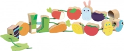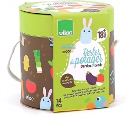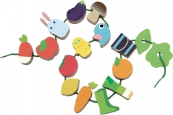Sada 14 ilustrovaných korálikov (napr. baklažán, paradajka, vtáčik, gumené čižmy) podporuje fantáziu, učenie farieb a pomenovávanie.