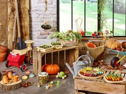 - 14 drevených korálikov s motívmi farmy (zelenina, ovocie, zvieratká, gumené čižmy a pod.)