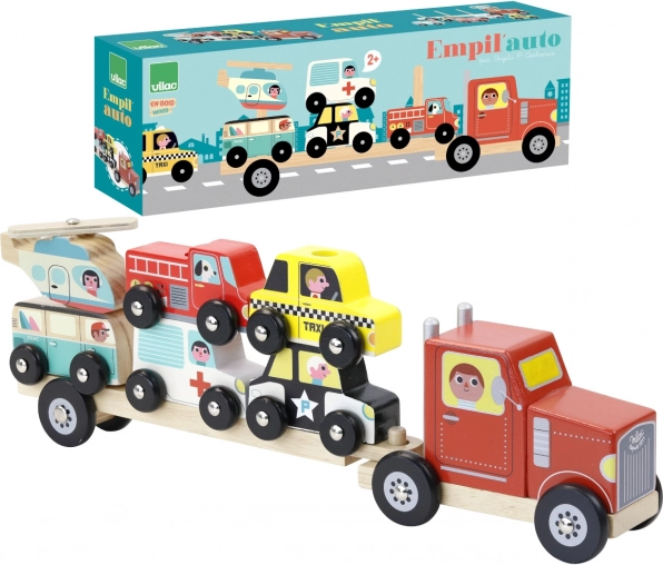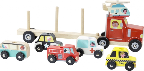 Tento robustný drevený kamión s odnímateľným prívesom je ideálny pre malých vodičov a milovníkov vozidielok. Deti môžu samy nakladať a vykladať 6 tematických dopravných prostriedkov a rozvíjať tak svoju zručnosť a logické myslenie. Farebné detaily a priateľský vzhľad podporujú imaginatívnu hru a učia deti spoznávať rôzne vozidlá.