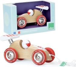 Štýlové ťahacie pretekárske autíčko z lakovaného dreva s kovovými pogumovanými kolesami a pevnou šnúrkou na jednoduché ťahanie. Hračka podporuje rovnováhu, hrubú motoriku a koordináciu pohybov. Kvalitné spracovanie a nadčasový dizajn zaručujú dlhú životnosť. Vyrobené vo Francúzsku.