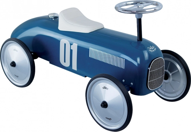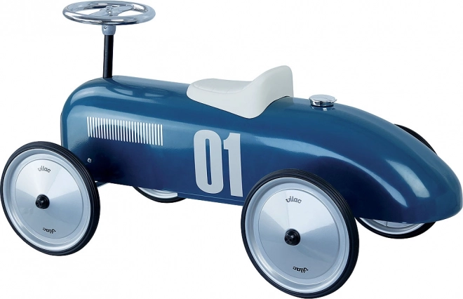 Štýlové vintage odrážadlo, ktoré kombinuje kovovú konštrukciu s atraktívnou modrou farbou, ideálne pre vašich najmenších milovníkov áut.