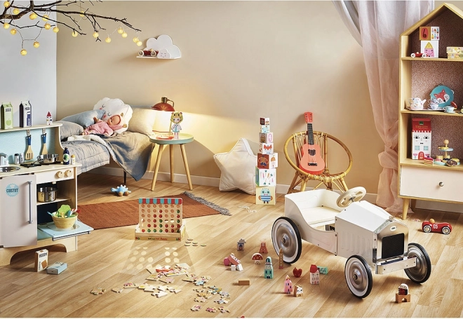 Štýlové drevené autíčko v elegantnej čiernej farbe poteší malých pretekárov aj milovníkov dizajnu. Vyrobené vo Francúzsku z lakovaného dreva, má tiché biele gumové kolesá pre plynulú jazdu na všetkých podlahách a nadčasový vintage vzhľad ideálny na hranie aj ako dekorácia.