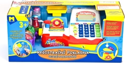 Obľúbená pokladnička s vysúvacou zásuvkou na peniaze, funkčnými tlačidlami, mikrofónom, váhou, košíkom a radom makiet potravín pre malých obchodníkov. Výrobok na batérie. Vhodné pre deti od 3 rokov.