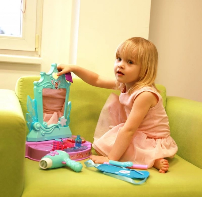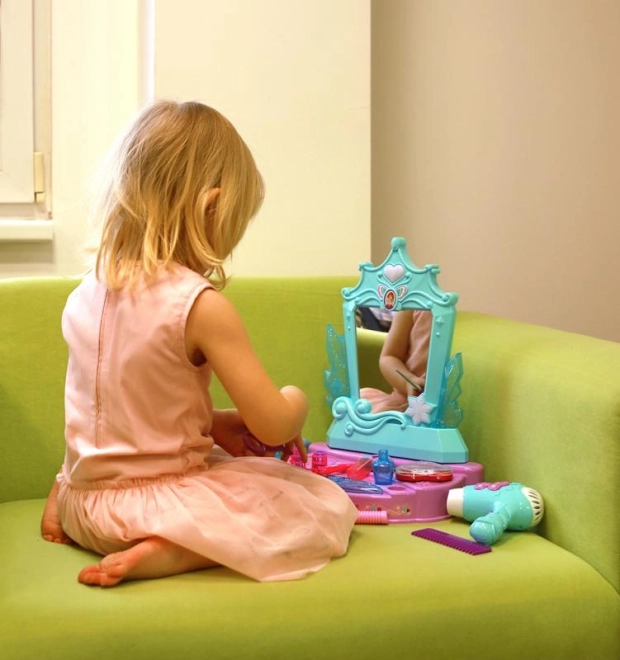 Tento štýlový toaletný set v tyrkysovo‑fialovej farebnej kombinácii prináša deťom hodiny tvorivej zábavy. Hlavnou dominantou je zrkadlo so svetelnými a zvukovými efektmi – po aktivácii spustí melódie, ktoré umocnia atmosféru pri hre na kadernícky či kozmetický salón.