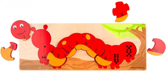 Počítacie puzzle húsenica BIGJIGS TOYS prepája učenie s hrou. Deti skladajú číslované dieliky 1–10 na drevenú podložku s čiernymi bodkami, ktoré zodpovedajú číslu na dieliku. Tým si upevňujú porozumenie množstvu, farbám a tvarom a zároveň trénujú koordináciu oko–ruka.