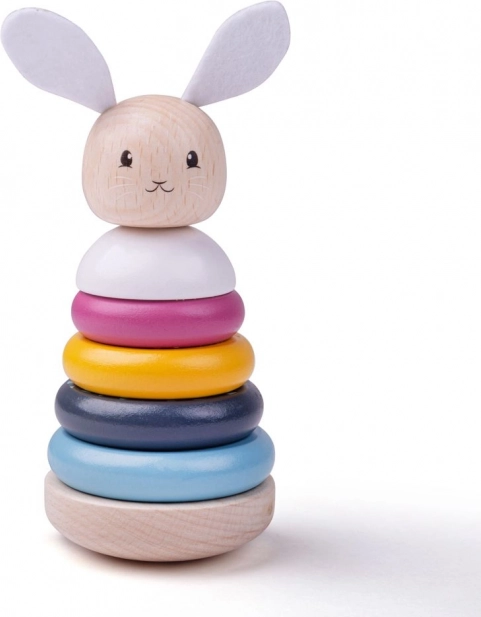 Táto kvalitná drevená nasadzovačka v pastelových farbách je ideálna prvá vzdelávacia hračka. Deti skladajú krúžky od najväčšieho po najmenší, posilňujú koordináciu oko–ruka a učia sa rozlišovať farby aj tvary. Textilné ušká a chvostík zajačika pridávajú hmatový rozmer hry.