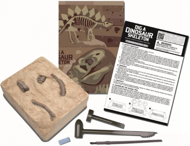 Sada obsahuje sadrový blok s kosťami, základné vykopávacie nástroje a návod. Stačí otvoriť krabicu a začať skúmať – ideálna aktivita na popoludnie aj víkend.
