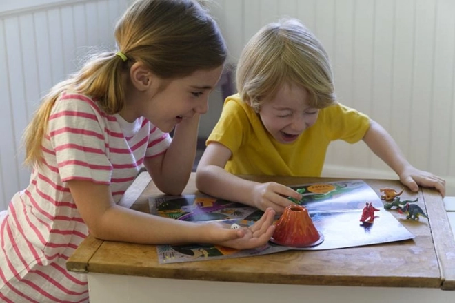 Namaľuj si 6 dinosaurov a sopku a môžeš hrať dobrodružnú hru a spustiť erupciu sopky.