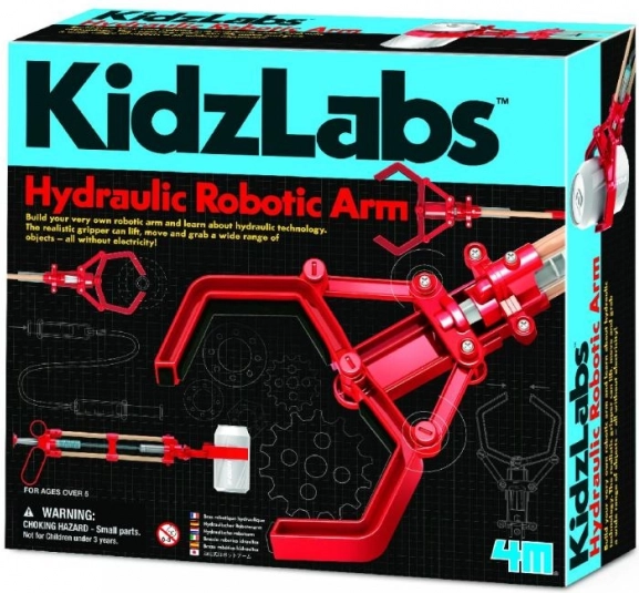 Ovládajte pohyby ramena a klieští čisto hydraulicky pomocou striekačiek a hadičiek. Skvelá ukážka prenosu sily tekutinou v reálnom modeli.