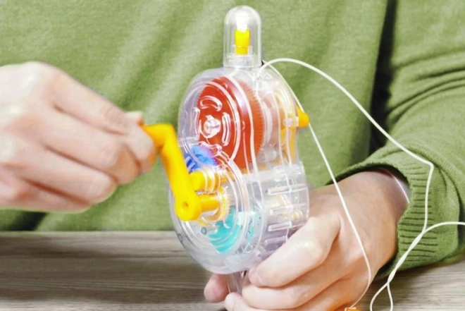 Otoč kľukou a vyrob elektrinu vlastnými silami. Priehľadné telo ukazuje prácu prevodov v reálnom čase.