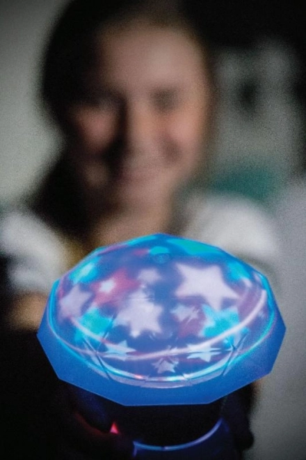 Lampička premieta hviezdičky a farebné vzory na steny a strop, čím vytvára pokojnú atmosféru na zaspávanie aj hranie.