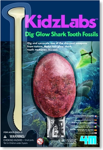 Obsahuje 2 žraločie zuby svietiace v tme zaliate do sadrového bloku, špeciálny nástroj, povrázok a inštrukcie.