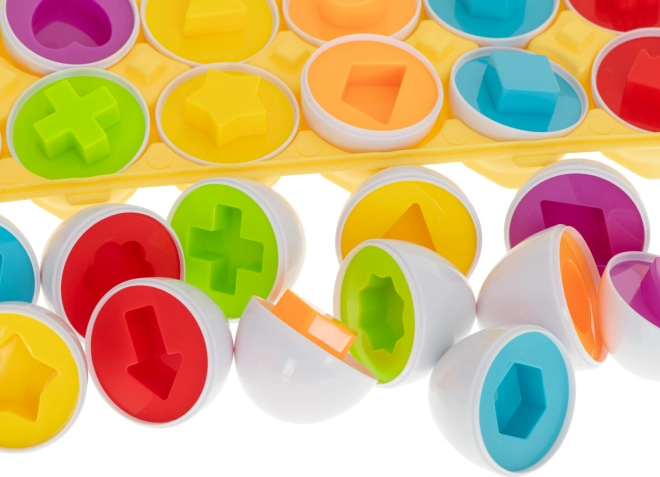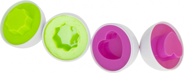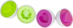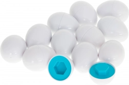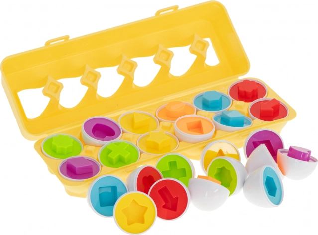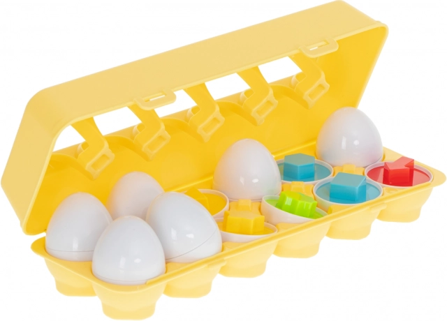 Súprava obsahuje 12 vajíčok s rôznymi tvarmi a farbami ukrytými pod škrupinou. Hra spočíva v priraďovaní polovice vajíčka podľa tvaru a farby tak, aby vytvorili celok. Toto je nielen zábavná, ale aj edukatívna činnosť, ktorá posilňuje logické myslenie. Vajíčka sú ľahké a ľahko prenosné, čo ich činí ideálnymi na zabavenie počas dlhých ciest alebo pri čakaní na návštevu u lekára.