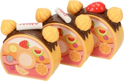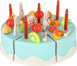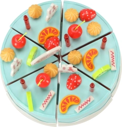 Šesť dielov torty je spojených suchým zipsom – deti ich ľahko rozkroja plastovým nožom a poskladajú späť. Ideálne na tréning jemnej motoriky a realistickú hru.