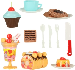 - Obsah sady (75 ks): 6× diel torty, 5× sviečka, 14× pusinka (bezé), 7× cukrová tyčinka, 4× čerešnička, 4× mandarínka, 3× jahoda, 3× kiwi, 4× zajačik, 1× nápis, 3× tanierik, 3× sušienka, 3× kúsok rolády, 3× cupcake, 1× šálka, 1× lyžička, 1× vidlička, 1× nožík, 1× lopatka na tortu, 1× pohár na zmrzlinu, sada samolepiek, sada suchých zipsov.