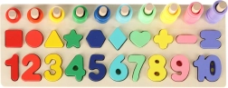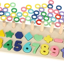 Táto montessori sada spája radosť zo skladania s učením. Deti priraďujú drevené geometrické tvary a čísla do správnych otvorov a zároveň na kolíky navliekajú farebné krúžky, ktorých počet zodpovedá danej číslici. Vďaka prehľadnej drevenej základni je učenie prirodzené a zábavné.