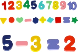 Deti priraďujú farebné tvary a číslice do správnych pozícií, čím trénujú zrakové rozlišovanie, logiku a slovnú zásobu (farby, tvary, čísla).