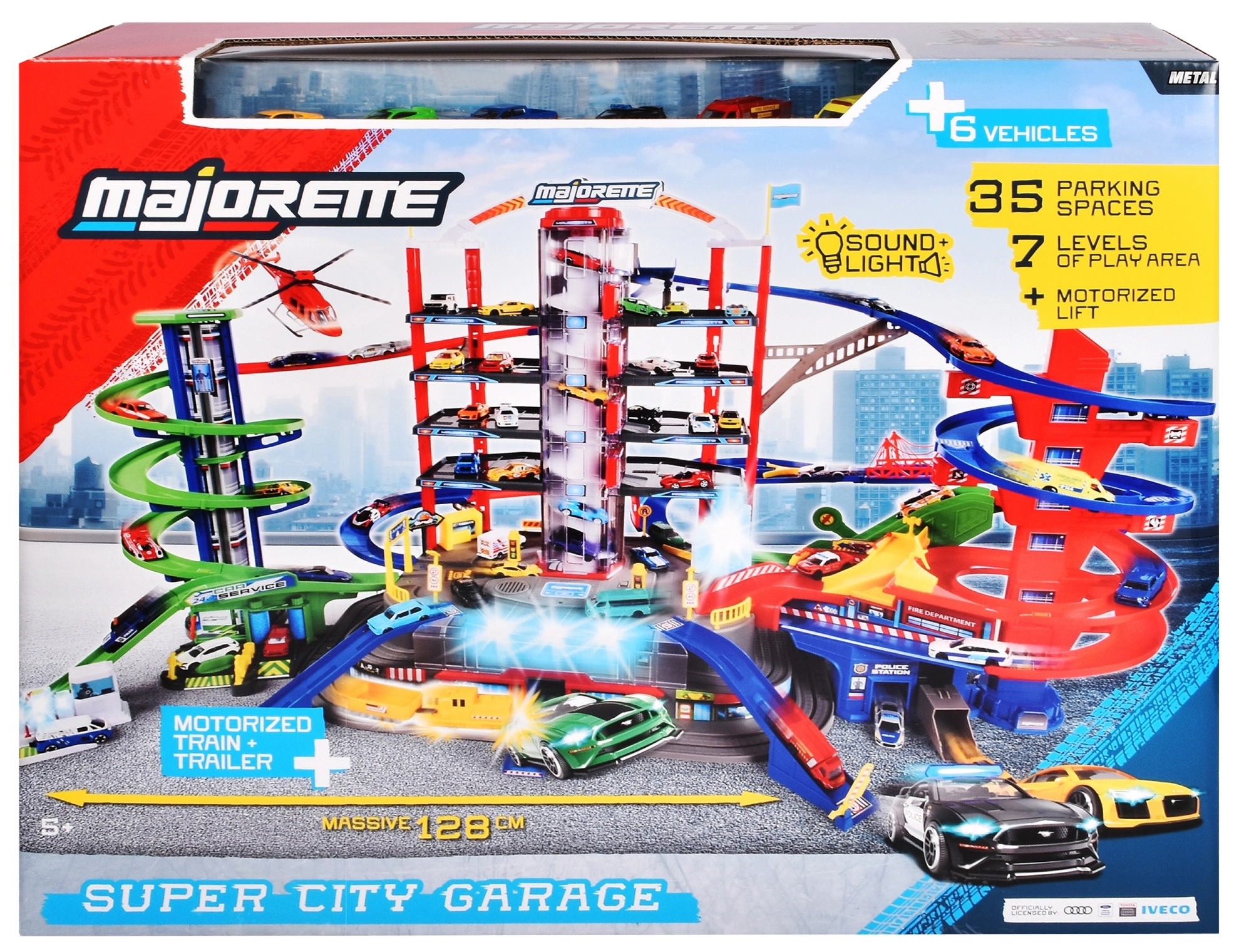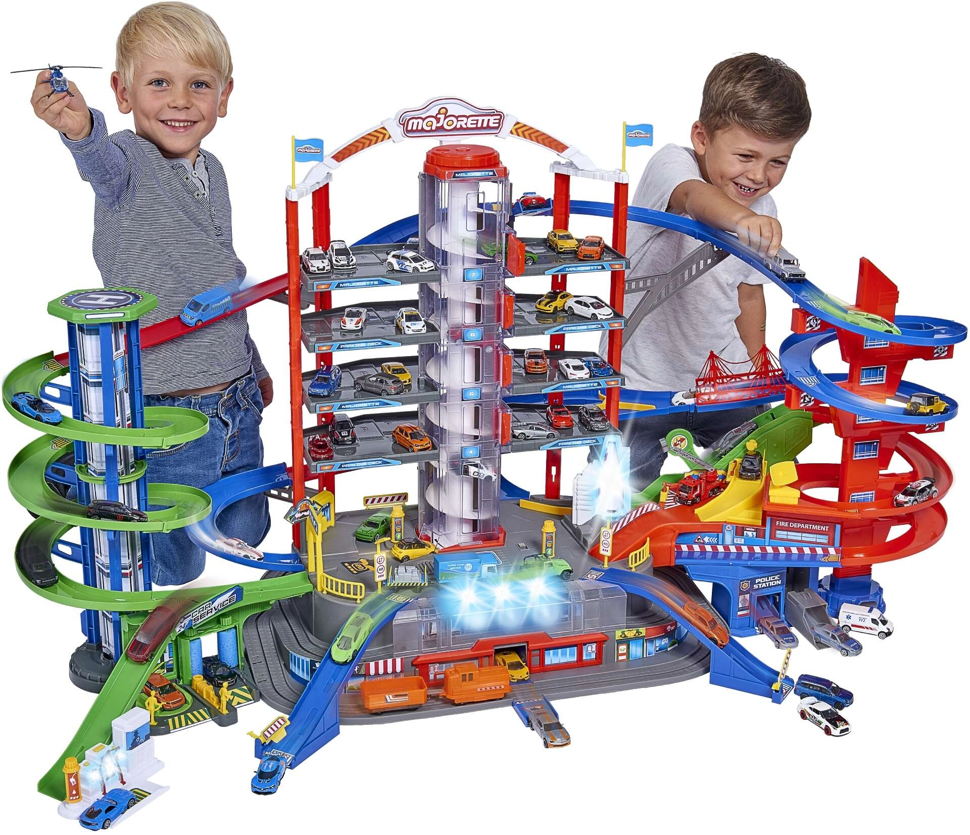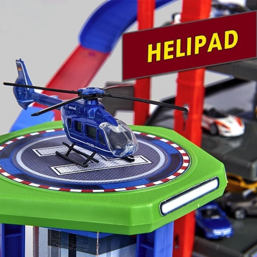 Objavte megaset pre malých vodičov: 7-poschodový garážový komplex Super City s výťahom, špirálovými rampami a 6 kovovými autíčkami doplnenými o lokomotívu so svetelnými a zvukovými efektmi. Nechýba heliport, stanica polície a hasičov, umývačka ani čerpacia stanica so zvukmi a svetlami – všetko pre maximálnu porciu akčnej a kreatívnej hry.