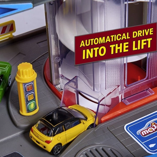 Tento veľký garážový set prináša deťom nekonečné možnosti hry na ploche siedmich poschodí. Farebné špirálové dráhy, batériou poháňaný výťah a realistické svetelné a zvukové efekty vtiahnu do deja každého malého nadšenca áut a vlakov. Kovové autíčka s voľne sa otáčajúcimi kolieskami jazdia hladko po rampách, zatiaľ čo lokomotíva s vagónom prechádza tajným tunelom a zastavuje na vlakovej stanici.