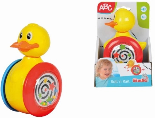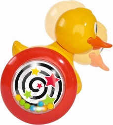 Kačička vo veselých farbách pri pohybe dopredu hýbe hlavou a hrká malými loptičkami, ktoré sú umiestnené v kolieskach.