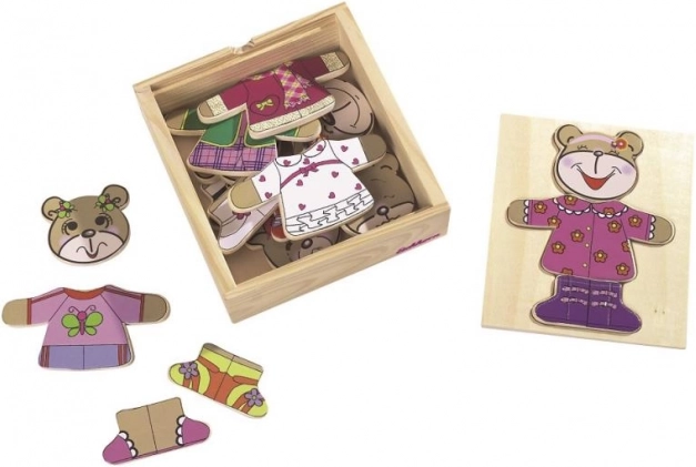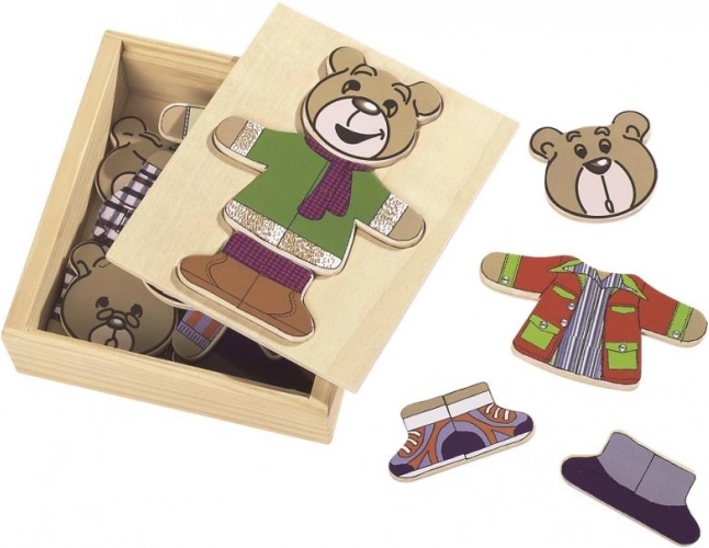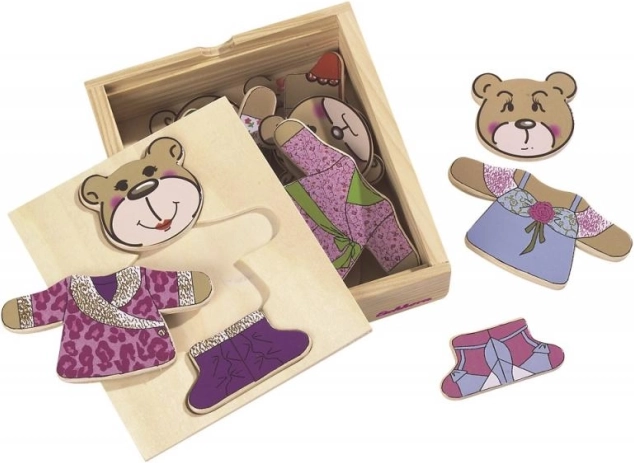 Obliekni si svojho medvedíka s touto zábavnou skladačkou! Obsahuje 20 dielov a prichádza v praktickom drevenom boxe.