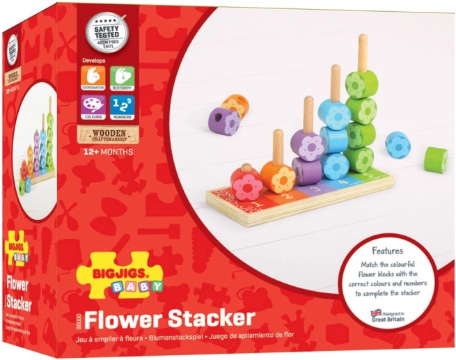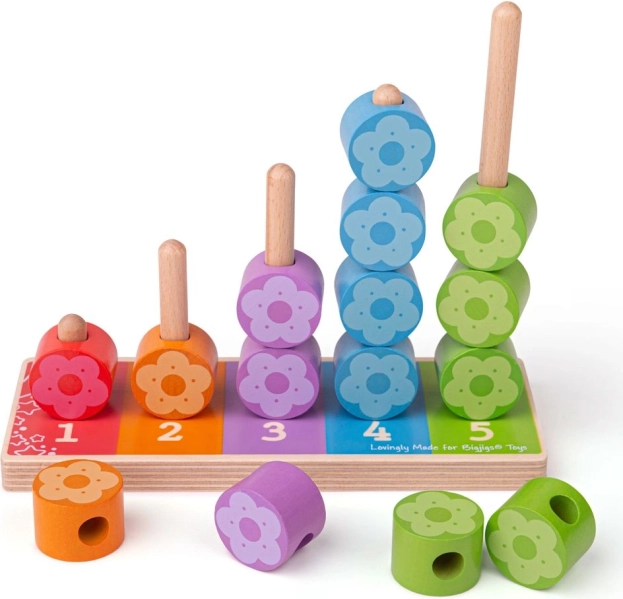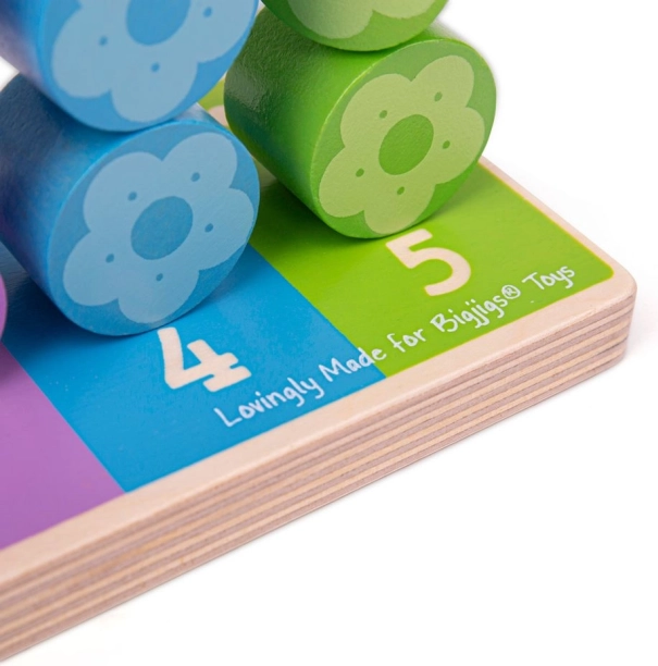 Každý stĺpik má svoj počet a farbu, takže deti ľahko pochopia princíp párovania a počtu. Kvietkové dieliky sa pohodlne držia aj malým rúčkam a motivujú k samostatnej hre aj spoločnému objavovaniu s rodičmi.