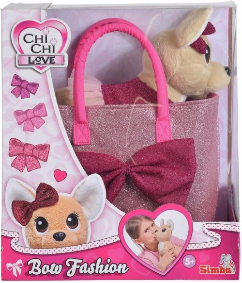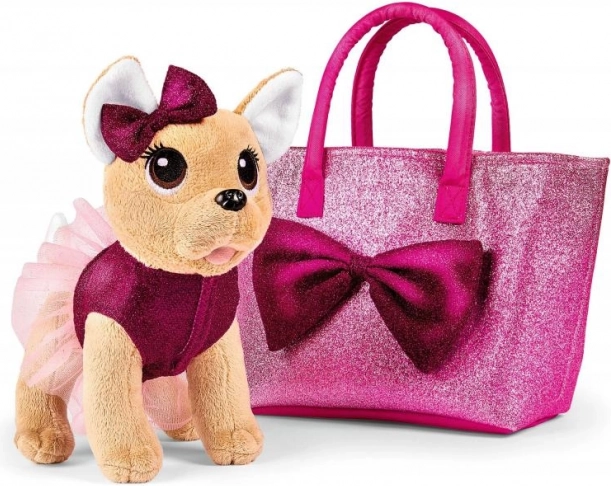 Plyšový psík čivava s mašľou v ružovom trblietavom oblečení s taškou s mašľou. Veľkosť 20 cm.