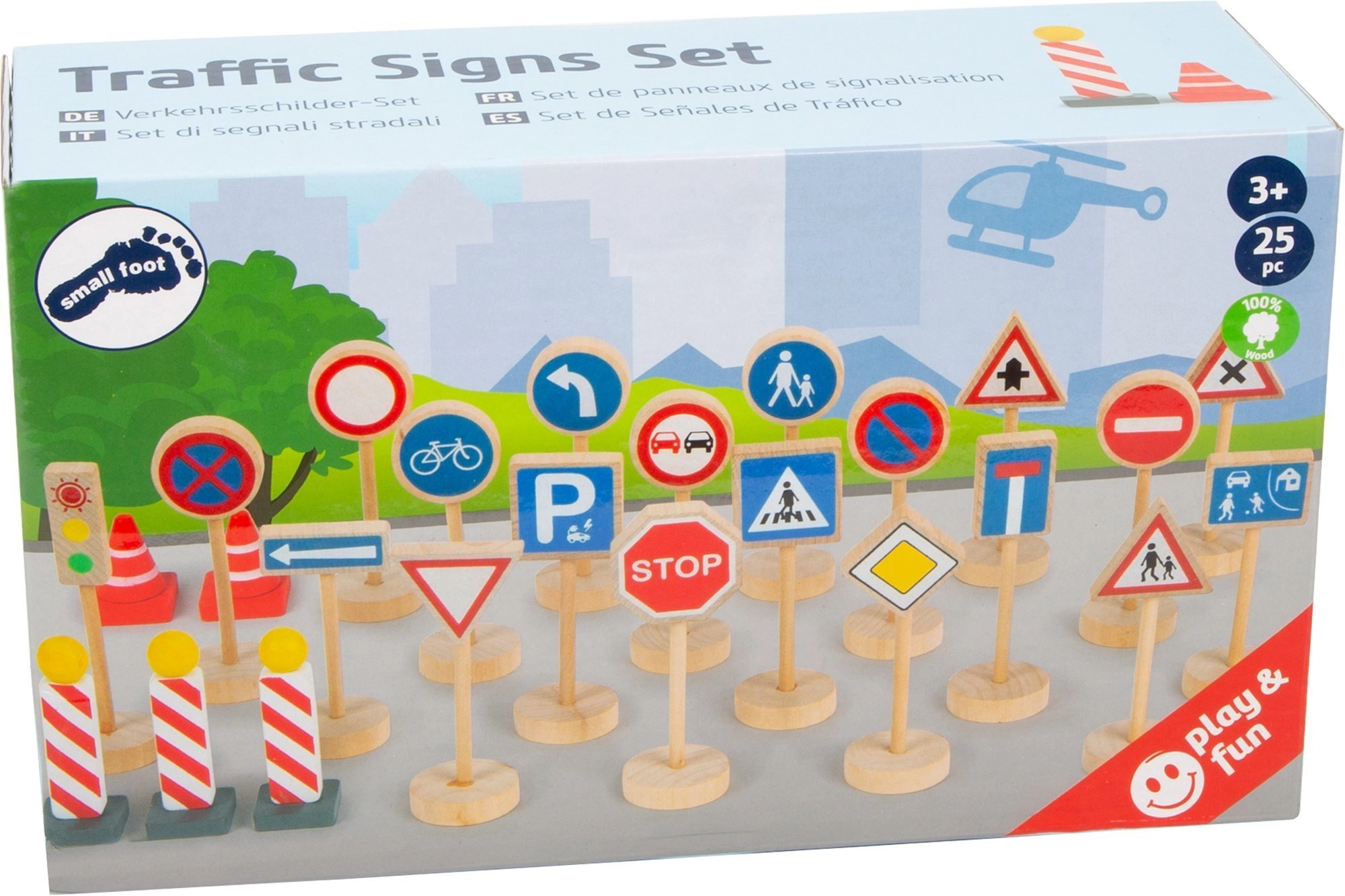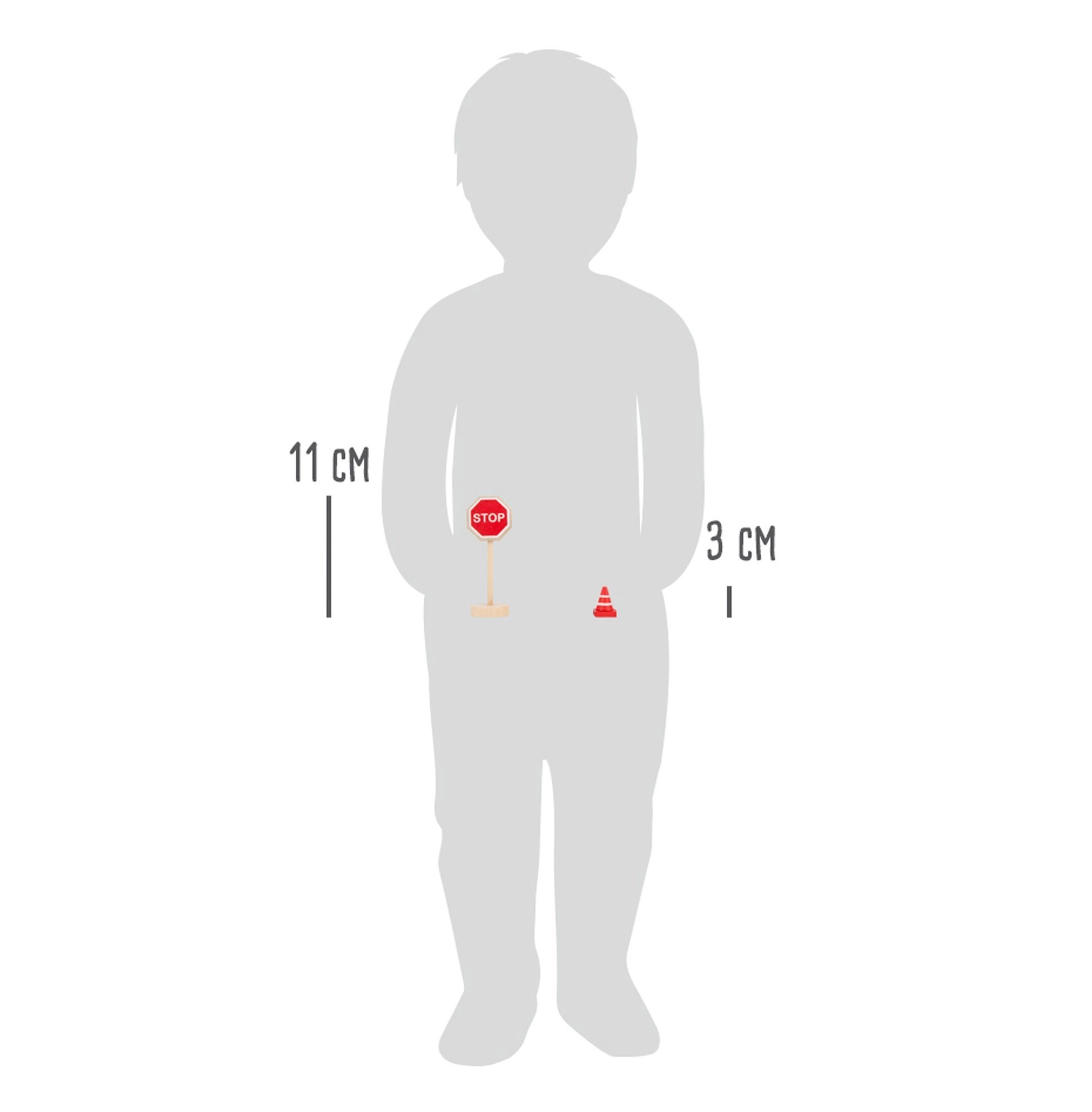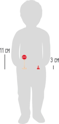 Táto kvalitná drevená sada prináša všetko, čo deti potrebujú na vytvorenie vlastného dopravného sveta. Nájdete v nej značky ako STOP, povinný smer vľavo, zákaz predchádzania, hlavná cesta, prechod pre chodcov, parkovisko, a tiež semafor, kužele a zábrany. Diely majú výšku približne 3–11 cm, dobre sa držia a vďaka stabilným podstavcom pevne stoja.