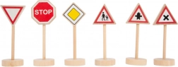 Sada 25 drevených dopravných značiek a doplnkov (napr. kužele) pomáha deťom pochopiť pravidlá cestnej premávky v realistických herných scenároch. Vďaka čitateľným symbolom a stabilným podstavcom sa s nimi dobre manipuluje a sú skvelým doplnkom k dopravným kobercom aj vláčikodráham.