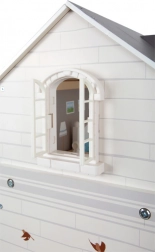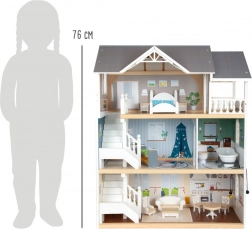 Domček pre bábiky má svetlú vonkajšiu fasádu, moderný dizajn a funkčné prvky ako posuvné dvere a otvárateľné okná.