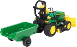 Traktor je vybavený prednou radlicou na odhŕňanie lístia či snehu a žacím ústrojenstvom, ktoré verne simuluje kosenie trávy. Deti tak ľahko napodobnia skutočné práce v záhrade a rozvíjajú jemnú motoriku aj fantáziu.