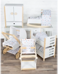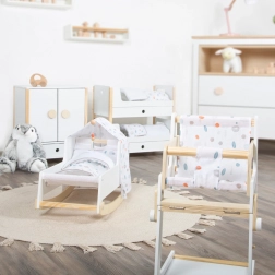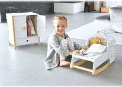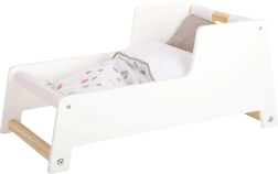 Súčasťou sú obojstranné, neutrálne ladené obliečky a veľká prikrývka, pod ktorou sa pohodlne zmestia bábiky či plyšáci do 46 cm. Jemné farby a minimalistické línie z nej robia vkusný doplnok do každého interiéru a podporujú kreatívnu a napodobňovaciu hru.