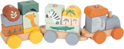 Drevený vláčik Safari je ilustrovaný v pastelových farbách s motívmi safari zvierat, čo činí hračku vizuálne atraktívnou pre malé deti.