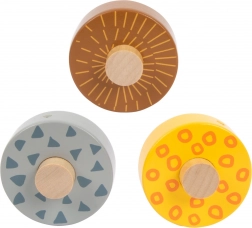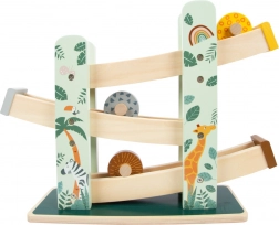 Táto krásna drevená dráha ponúka deťom možnosť sledovať, ako tri kolieska, každé s unikátnym dizajnom, schádzajú dole po troch rampách. Je dekorovaná ilustráciami zvierat žijúcich na safari a rastlín z džungle.