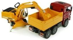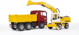 Táto úžasná stavebná sada od firmy Bruder zahŕňa nákladný voz MAN TGA s mäkkými pneumatikami a praktickou sklopnou korbou. Spolu s ním nájdete funkčný bager Liebherr, ktorý sa pýši stabilizačnými opornými nohami, profilovanými pneumatikami a rýpadlom s otočnou kabínou o 360°. Výrobok je kvalitne spracovaný v Nemecku z odolných materiálov.