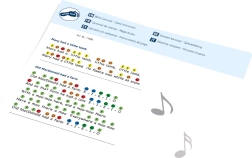 Súčasťou balenia sú notové zápisy s farebnými značkami a obľúbenými detskými pesničkami pre rýchly štart.