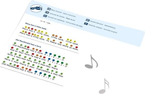 Balíček obsahuje paličku a farebne označené noty s ôsmimi známymi skladbami, ako sú „Ujo Donald farmu mal“, „Rolničky“ alebo „Trblietaj sa, hviezdička“. Hra na zvončeky rozvíja hudobné vnímanie, motoriku a podporuje sústredenie – skvelé na domáce hranie aj použitie v škôlkach a na 1. stupni ZŠ.