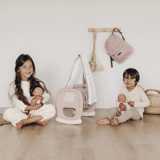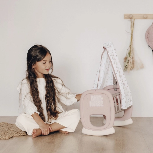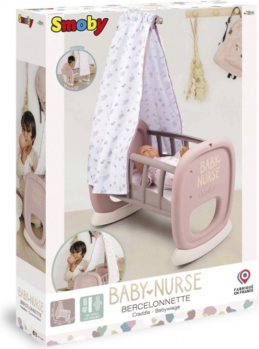 Detská kolíska Smoby Baby Nurse s látkovým baldachýnom prináša deťom realistickú hru na rodičov. Vďaka zaoblenej hojdacej základni môžu malé opatrovateľky jemne ukolísať svoju bábiku k spánku, zatiaľ čo mäkký baldachýn vytvára útulné zázemie.