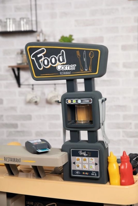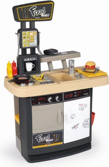 Otvorte si vlastný malý fast food! Detský Food Corner 2v1 od značky Smoby kombinuje kuchynku a výdajným pultom s pokladňou. Deti môžu pripravovať burgre, hranolky či palacinky a zároveň obsluhovať zákazníkov pri pulte – presne ako v skutočnej reštaurácii.