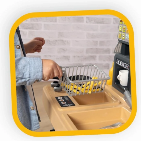 Set zaujme množstvom detailov: platňa, fritéza, drez s kohútikom, rúra, chladnička, dávkovač nápojov, kávovar a závesné háčiky na náradie. Nechýba platobný terminál, bloky, kreditná karta ani vytlačené menu. Po hre možno zvyšky „upratať“ do koša. Celkovo 29 doplnkov podporuje bohaté role-play scenáre a jemnú motoriku.