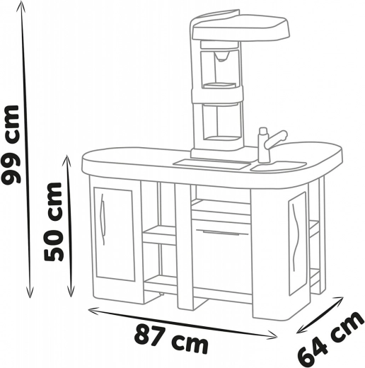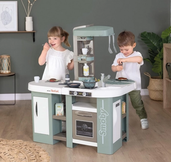 Táto priestranná kuchynka inšpirovaná značkou TEFAL ponúka všetko pre autentickú hru: pracovnú dosku, drez s batériou, kávovar na kapsuly, výrobník perlivých nápojov, rúru, umývačku, chladničku a otvorené poličky. Elektronická funkcia magického hrnca po naliatí vody a stlačení tlačidla vytvára skutočné bublinky, ktoré uchvátia každého malého kuchára.