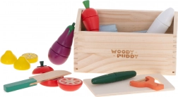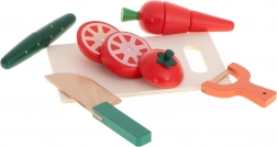 - mrkva, petržlen (reďkovka), uhorka, paradajka (vrátane plátkov), citrón, baklažán, lopárik, bezpečný nôž, bezpečná škrabka, drevená debnička