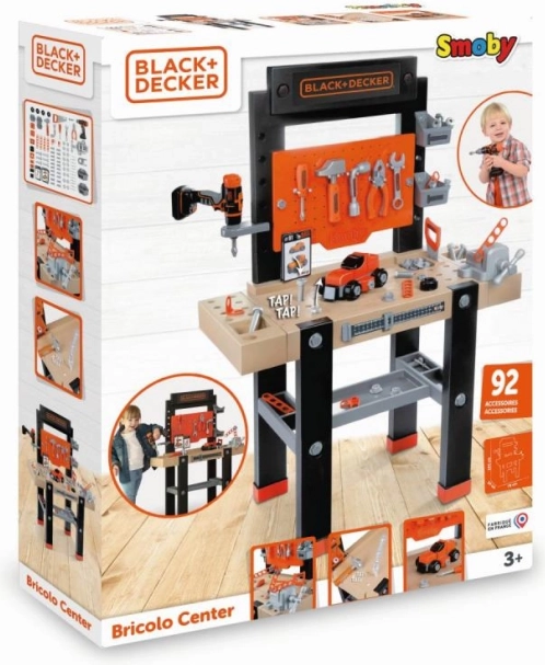 Veľký detský pracovný ponk BLACK+DECKER Bricolo Center od značky Smoby prináša realistickú dielňu s 92 doplnkami. Nájdete v ňom mechanickú vŕtačku, zverák, skrutkovače, kladivo, pílku, kliešte aj autíčko na zostavenie. Stabilná konštrukcia, praktické úložné priestory a rozmery 103 × 79 × 34 cm podporujú rozvoj motoriky a kreativity detí od 3 rokov.
